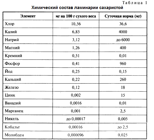 Химический состав богат и разнообразен. Морской деликатес по сравнению с большинством других продуктов на растительной и животной основе, доступных на суше, содержит огромное разнообразие полезных элементов. Богатый источник минералов: магния, кальция, калия, селена, цинка, железа. Ламинария богата йодом.