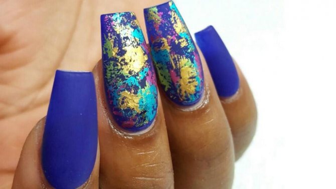 Маникюр «битое стекло» — очень популярная техника использования фольги. Создайте на своих ногоготках некое подобие сколов, которые зачаруют вас своей игрой света.