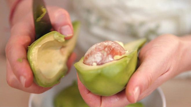 Вымытый и высушенный авокадо необходимо надрезать вдоль и две половинки повернуть в противоположные стороны. Если продукт спелый, то они хорошо отделятся друг от друга. Затем извлекается косточка, а мякоть выскабливается чайной ложкой. Если плод не совсем спелый, то половинки будут отделяться с трудом. Тогда кожицу авокадо можно очистить ножом или овощечисткой.