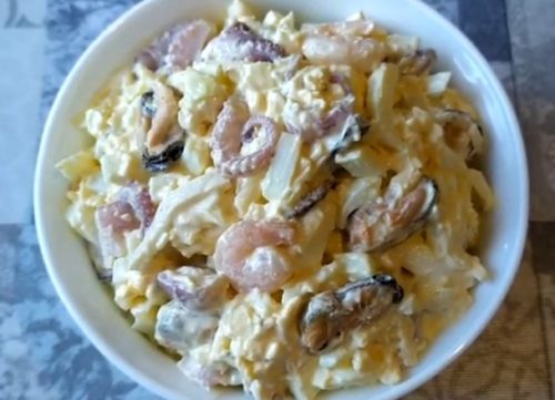 Простой и вкусный салат с морским коктейлем, яйцом и сыром