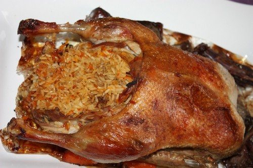 Это блюдо вполне может претендовать на роль главы праздничного застолья, поскольку оно богато смотрится и получается ароматным и сытным. Для фаршировки птицы используется рис и морковь, а натирается она перед запеканием смесью меда с горчицей.