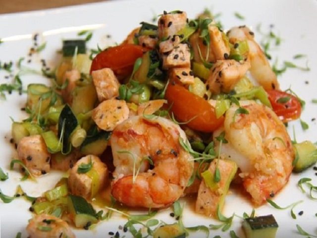 Креветки считаются одним из самых вкусных морских деликатесов. Они богаты белком и кальцием и при этом достаточно низкокалорийные. Овощи с креветками ароматное и легкое в приготовлении блюдо. Подавать его лучше всего со сметанным соусом.